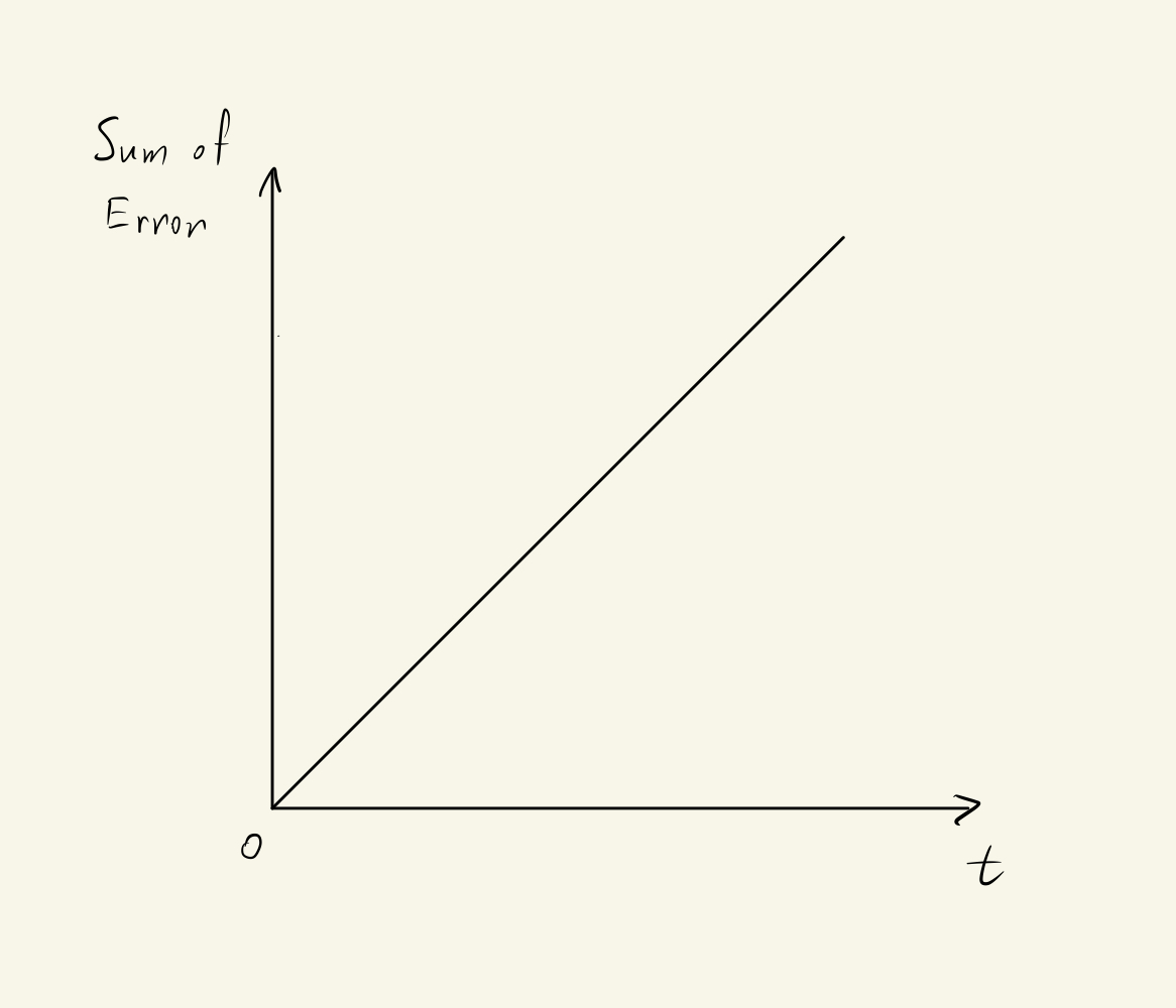 Cooperating with the Proportional Controller, the Integrational Controller can drive the Error down to zero. When Oil reaches 100m, the Proportional Controller does nothing since the Error is zero. But the Integrational Controller has been summing and subtracting values until the Take-Copter came to rest at 100rpm, which is required for Oil to hover, without rising and falling. At that moment, the output from the Integrational Controller would be zero, since the input to the controller at this point is zero.