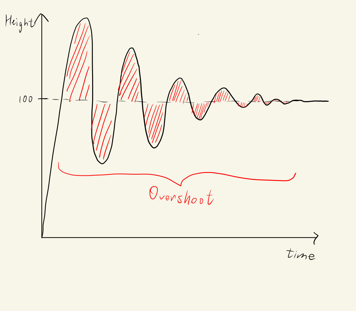 Imagine, using the Oil using Take-Copter scenario, when Oil uses a very large kp such that he can rise very fast and reach 100m in a very short time. However, because of the large kp, the rasing of Oil will overshoot, which means Oil will rise above 100m for a certain time before falling back to 100m. With the aid of the Integrational Controller, Oil may rise even higher before Oil can become steady and hover. However, when Oil rises higher than 100m, the Error calculated would be negative (e.g. Oil is at 110m now. Error = Setpoint - Output = 100 - 110 = -10m). The Take-Copter will then provide a downward thrust for Oil to fall at a faster speed such that Oil can reach 100m. Again, because of the very large kp, the Take-Copter would overshoot again and Oil would fall below 100m.