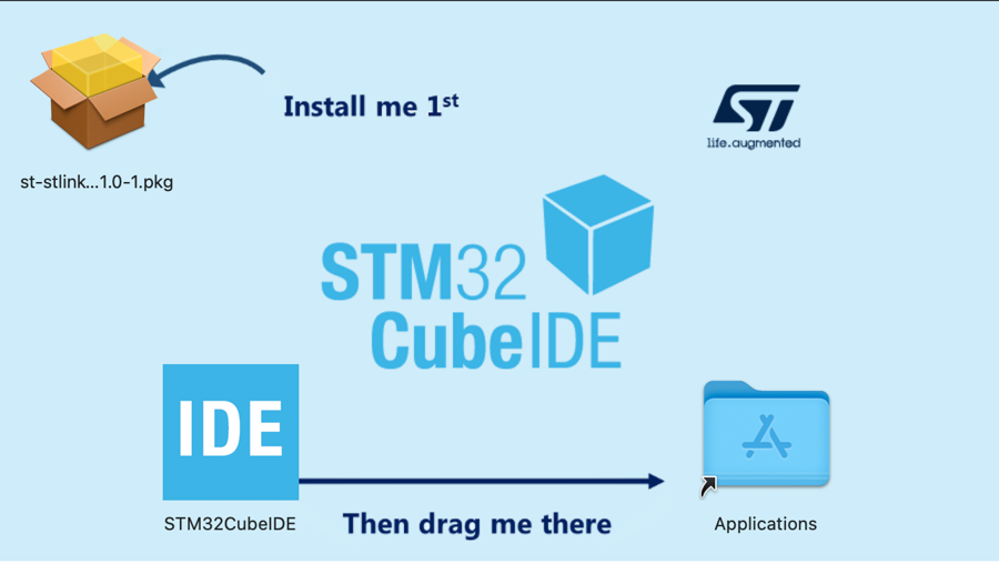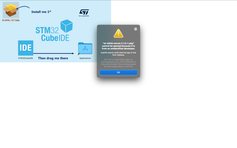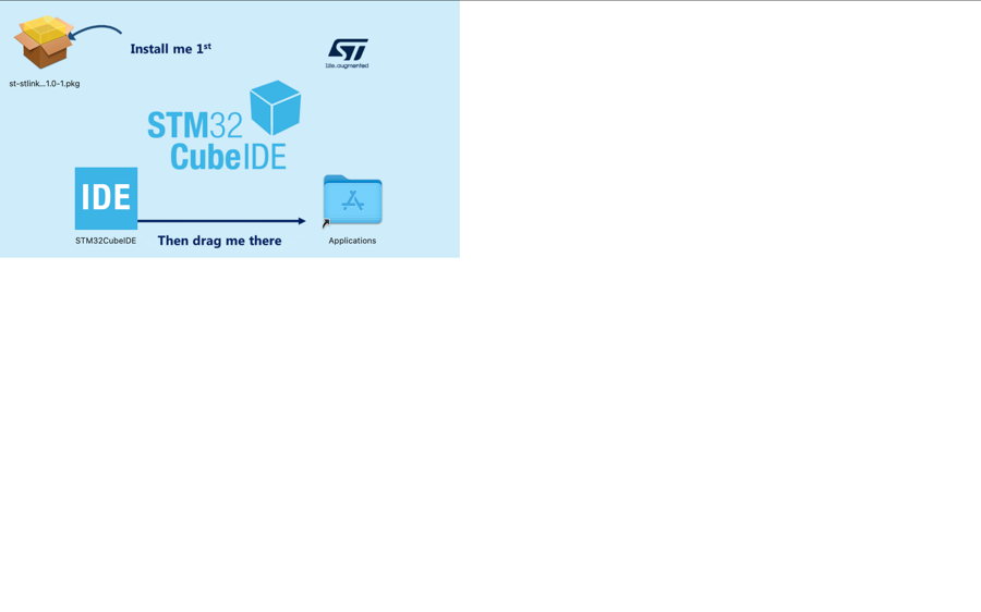 After you have done installing the st-stlink-server.2.1.0-1.pkg, install STM32CubeIDE by dragging the Application icon to the Application folder