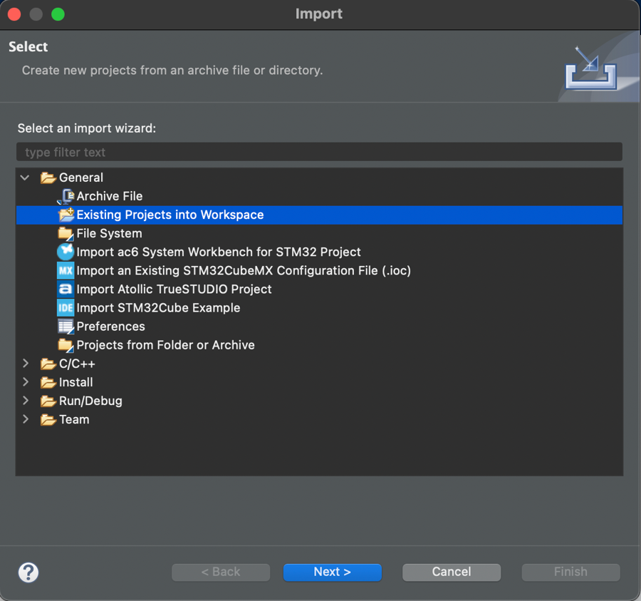 Under General choose "Existing Projects into Workspace"
