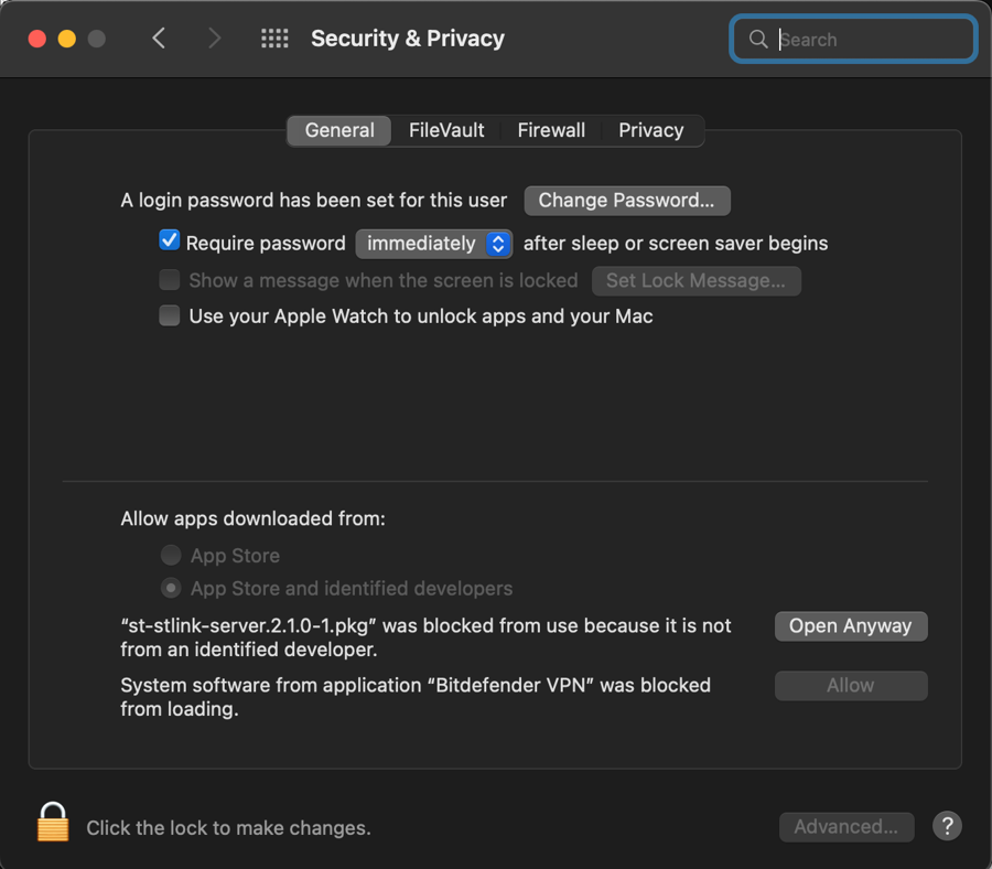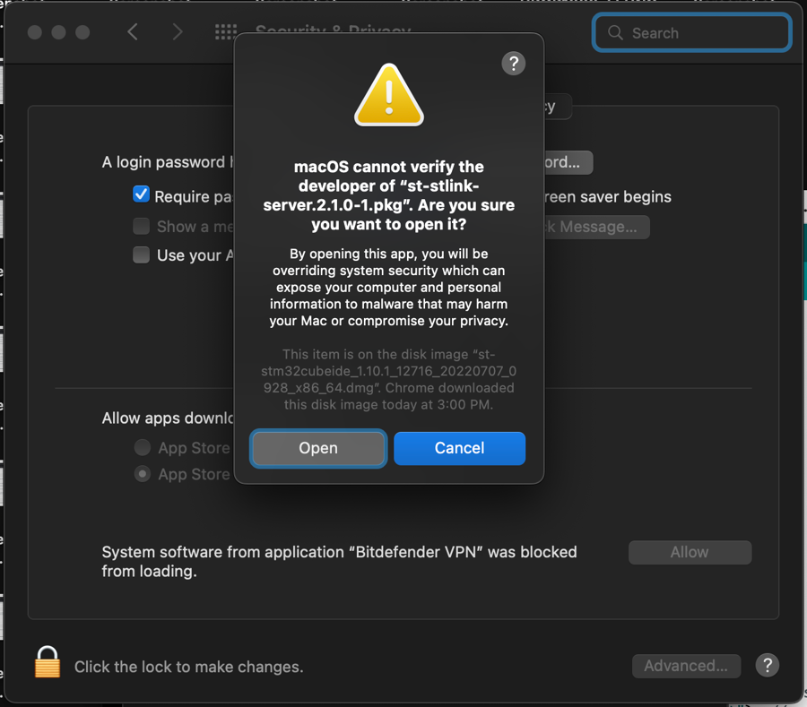Go to System Preferences>Security&Privacy, search near the bottom right region, click "Open Anyway" for "st-stlink-server.2.1.0-1.pkg"
