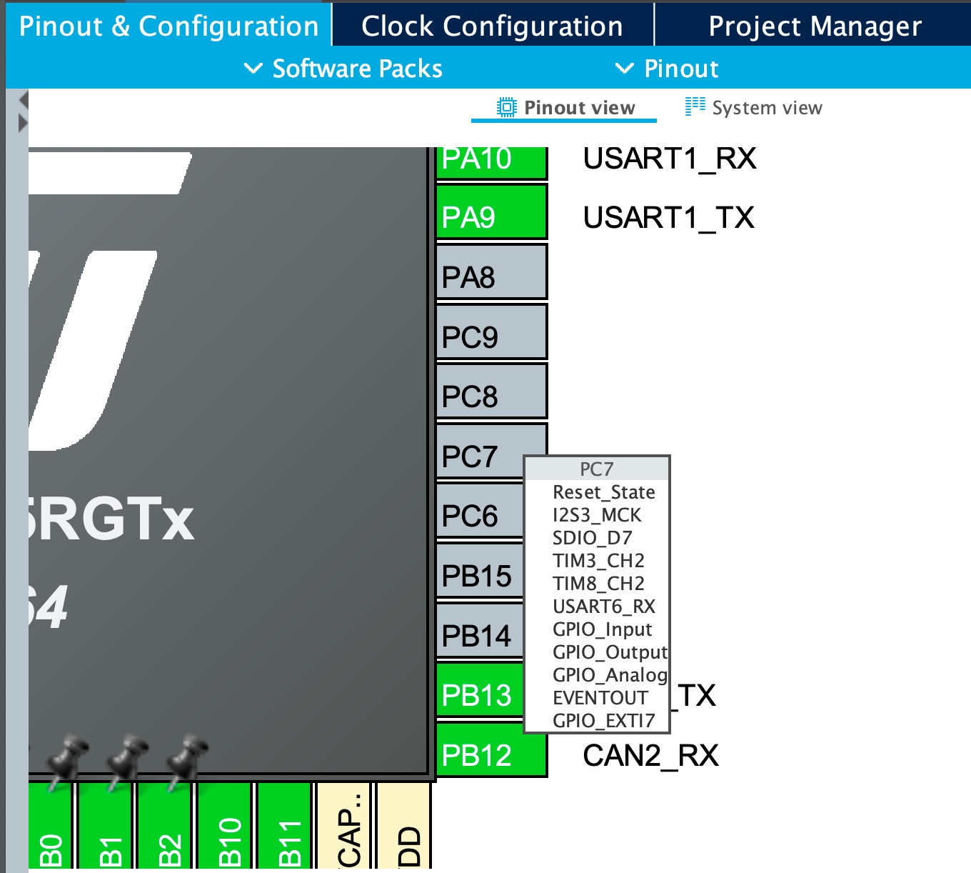 Assign the GPIO pin to be the specific timer and channel. e.g Assign the PC7 pin to output the pwm signal of TIM3_CH2.