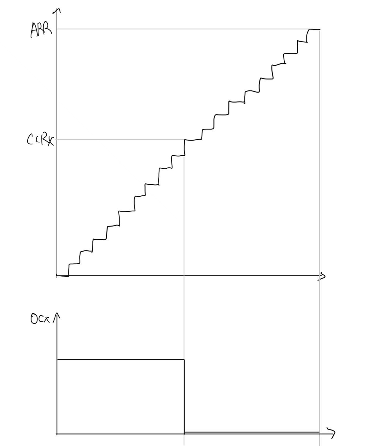 The ARR (auto-reload counter) from the previous paragraph is used as a downscaler of clock frequency. But in here, it acts as a denominator and CCRx