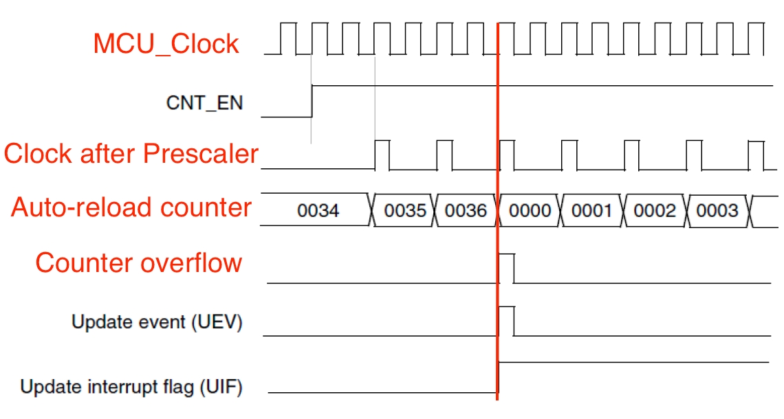As you can see, when there are 37 peaks in clock after prescaler, the auto-reload counter increases by 1, when the value is > 36, 1 peak in Counter overflow is generated and the counter is reset to 0. Again, we are programmers, so the auto-reload counter = 36.